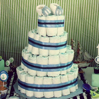 Mas o que não pode faltar é o famoso bolo de fraldas, que com toda delicadeza é feito com fraldas enroladas envolvidas em fitas de cetim. Deverá estar no centro da linda decoração cercado com todo tipo de mimo escolhido com tanto carinho. Com tudo pronto e os convidados presentes, a brincadeira pode começar.