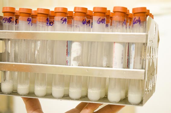 <a href="https://www.famivita.com/fr/wp-content/uploads/pasteurização-de-leite-humano-2.jpg"Banho-maria onde os frascos de leite ficam submersosEssa etapa é importante pois se não for bem feita a pasteurização o leite terá de ser submetido a uma nova pasteurização. Um exame é feito em pequenos tubos de ensaio para que seja analisado o crescimento bacteriano e caso seja crescimento negativo para colônias de bactérias o leite será armazenado e enviado para consumo dos bebês. Cada leite tem um nível de gordura diferente. A gordura do leite é benéfica, pois essa que faz o bebê ganhar peso, nenhum leite é fraco! Cada vidro tem seu teor de gordura anotado e direcionado para quem mais necessita de maior concentração de gordura. Leites mais amarelinhos tendem a serem mais gordurosos.