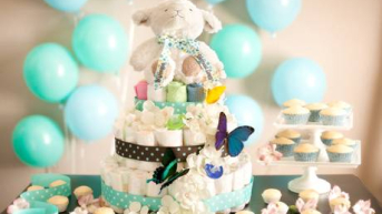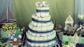 Mas o que não pode faltar é o famoso bolo de fraldas, que com toda delicadeza é feito com fraldas enroladas envolvidas em fitas de cetim. Deverá estar no centro da linda decoração cercado com todo tipo de mimo escolhido com tanto carinho. Com tudo pronto e os convidados presentes, a brincadeira pode começar.