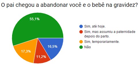 Esse número é levemente superior aos 45% de grávidas que são deixadas pelo menos temporariamente após a ocorrência do abalo, ou seja, 20% da população feminina em total chegam a ser abandonadas. Enquanto 39% dos pais voltam para a mulher antes do parto do bebê, 36% não assumem a paternidade, nem sequer após o nascimento. O restante assume seu filho depois do parto.